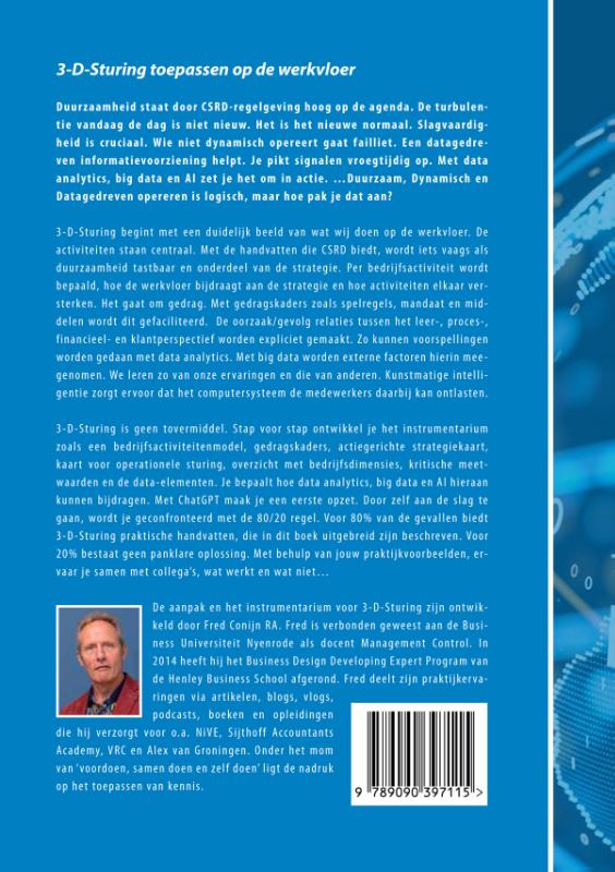 3-D-Sturing toepassen op de werkvloer Duurzaamheid staat door CSRD-regelgeving hoog op de agenda. De turbulentie vandaag de dag is niet nieuw. Het is het nieuwe normaal. Slagvaardigheid is cruciaal. Wie niet dynamisch opereert gaat failliet. Een datagedreven informatievoorziening helpt. Je pikt signalen vroegtijdig op. Met data analytics, big data en AI zet je het om in actie. …Duurzaam, Dynamisch en Datagedreven opereren is logisch, maar hoe pak je dat aan? 3-D-Sturing begint met een duidelijk beeld van wat wij doen op de werkvloer. De activiteiten staan centraal. Met de handvatten die CSRD biedt, wordt iets vaags als duurzaamheid tastbaar en onderdeel van de strategie. Per bedrijfsactiviteit wordt bepaald, hoe de werkvloer bijdraagt aan de strategie en hoe activiteiten elkaar versterken. Het gaat om gedrag. Met gedragskaders zoals spelregels, mandaat en middelen wordt dit gefaciliteerd. De oorzaak/gevolg relaties tussen het leer-, proces-, financieel- en klantperspectief worden expliciet gemaakt. Zo kunnen voorspellingen worden gedaan met data analytics. Met big data worden externe factoren hierin meegenomen. We leren zo van onze ervaringen en die van anderen. Kunstmatige intelligentie zorgt ervoor dat het computersysteem de medewerkers daarbij kan ontlasten. 3-D-Sturing is geen tovermiddel. Stap voor stap ontwikkel je het instrumentarium zoals een bedrijfsactiviteitenmodel, gedragskaders, actiegerichte strategiekaart, kaart voor operationele sturing, overzicht met bedrijfsdimensies, kritische meetwaarden en de data-elementen. Je bepaalt hoe data analytics, big data en AI hieraan kunnen bijdragen. Met ChatGPT maak je een eerste opzet. Door zelf aan de slag te gaan, wordt je geconfronteerd met de 80/20 regel. Voor 80% van de gevallen biedt 3-D-Sturing praktische handvatten, die in dit boek uitgebreid zijn beschreven. Voor 20% bestaat geen panklare oplossing. Met behulp van jouw praktijkvoorbeelden, ervaar je samen met collega’s, wat werkt en wat niet… De aanpak en het instrumentarium voor 3-D-Sturing zijn ontwikkeld door Fred Conijn RA. Fred is verbonden geweest aan de Business Universiteit Nyenrode als docent Management Control. In 2014 heeft hij het Business Design Developing Expert Program van de Henley Business School afgerond. Fred deelt zijn praktijkervaringen via artikelen, blogs, vlogs, podcasts, boeken en opleidingen die hij verzorgt voor o.a. NiVE, Sijthoff Accountants Academy, VRC en Alex van Groningen. Onder het mom van ‘voordoen, samen doen en zelf doen’ ligt de nadruk op het toepassen van kennis.