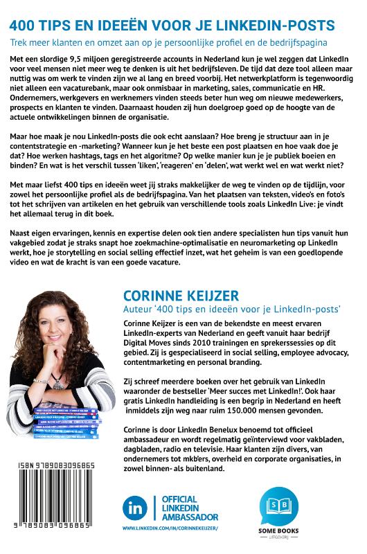 400 tips en ideeën voor je LinkedIn-posts Trek meer klanten en omzet aan op je persoonlijke profiel en de bedrijfspagina. Met een slordige 9,5 miljoen geregistreerde accounts in Nederland kun je wel zeggen dat LinkedIn voor veel mensen niet meer weg te denken is uit het bedrijfsleven. De tijd dat deze tool alleen maar nuttig was om werk te vinden zijn we al lang en breed voorbij. Het netwerkplatform is tegenwoordig niet alleen een vacaturebank, maar ook onmisbaar in marketing, sales, communicatie en HR. Ondernemers, werkgevers en werknemers vinden steeds beter hun weg om nieuwe klanten, medewerkers en prospects en te vinden. Daarnaast houden zij hun doelgroep goed op de hoogte van de actuele ontwikkelingen binnen de organisatie. Maar hoe maak je nou LinkedIn-posts die ook echt aanslaan? Hoe breng je structuur aan in je contentstrategie en -marketing? Wanneer kun je het beste een post plaatsen en hoe vaak doe je dat? Hoe werken hashtags, tags en het algoritme? Op welke manier kun je je publiek boeien en binden? En wat is het verschil tussen ‘liken’, ‘reageren’ en ‘delen’, wat werkt wel en wat werkt niet? Met maar liefst 400 tips en ideeën weet jij straks makkelijker de weg te vinden op de tijdlijn, voor zowel het persoonlijke profiel als de bedrijfspagina. Van het plaatsen van teksten, video’s en foto’s tot het schrijven van artikelen en het gebruik van verschillende tools zoals LinkedIn Live: je vindt het allemaal terug in dit boek. Naast eigen ervaringen, kennis en expertise delen ook tien andere specialisten hun tips vanuit hun vakgebied zodat je straks snapt hoe zoekmachine-optimalisatie en neuromarketing op LinkedIn werkt, hoe je storytelling en social selling effectief inzet, wat het geheim is van een goedlopende video en wat de kracht is van een goede vacature. Corinne Keijzer - auteur '400 tips en ideeën voor je LinkedIn-posts' Corinne Keijzer is een van de bekendste en meest ervaren LinkedIn-experts van Nederland en geeft vanuit haar bedrijf Digital Moves sinds 2010 trainingen en sprekerssessies op dit gebied. Zij is gespecialiseerd in social selling, employee advocacy, contentmarketing en personal branding. Zij schreef meerdere boeken over het gebruik van LinkedIn waaronder de bestseller Meer succes met LinkedIn!. Ook haar gratis LinkedIn handleiding is een begrip in Nederland en heeft inmiddels zijn weg naar ruim 150.000 mensen gevonden. Corinne is door LinkedIn Benelux benoemd tot officieel ambassadeur en wordt regelmatig geïnterviewd voor vakbladen, dagbladen, radio en televisie. Haar klanten zijn divers, van ondernemers tot mkb’ers, overheid en corporate organisaties, in zowel binnen- als buitenland.