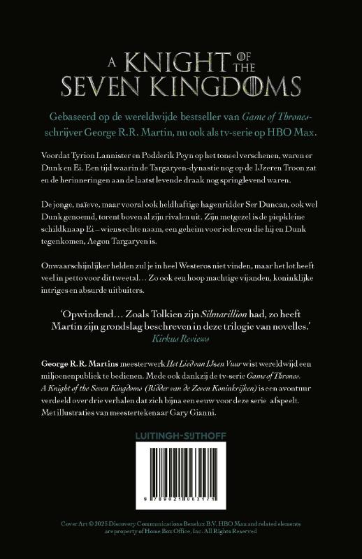 In Ridder van de Zeven Koninkrijken – binnenkort te zien als A Knight of the Seven Kingdoms op HBO – zijn de eerste drie officiële novelles samengevoegd die voorafgaan aan George R.R. Martins meesterwerk Het Lied van IJs en Vuur, dat eerder meesterlijk werd verfilmd als Game of Thrones. Voordat Tyrion Lannister en Podderik Peyn op het toneel verschenen, waren er Dunk en Ei. Een tijd waarin de Targaryen-dynastie nog op de IJzeren Troon zat en de herinneringen aan de laatst levende draak nog springlevend waren. De jonge, naïeve, maar vooral ook heldhaftige hagenridder ser Duncan de Lange torent boven al zijn rivalen uit. Zijn metgezel is de piepkleine schildknaap Ei – wiens echte naam (een geheim voor iedereen die hij en Dunk tegenkomen) Aegon Targaryen is. Onwaarschijnlijker helden zul je in heel Westeros niet vinden, maar het lot heeft veel in petto voor dit tweetal… zo ook een hoop machtige vijanden, koninklijke intriges en absurde uitbuiters. Met illustraties van meestertekenaar Gary Gianni. ‘De echte reden om deze bundel te lezen is dat het gewoonweg een geweldig verhaal is. Martin creëert een levende, ademende wereld op een manier die maar weinig auteurs kunnen…’ Tech Times