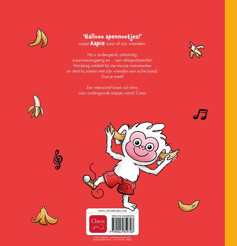 ‘Hallooo apennootjes!’ roept Aapie naar al zijn vrienden. Hij is … ondeugend, onhandig, supernieuwsgierig en … een allesprobeerder! Vandaag ontdekt hij vier mooie instrumenten én start hij samen met zijn vrienden een echte band. Doe je mee? Een interactief boek vol ritme, voor ondeugende aapjes vanaf 3 jaar.