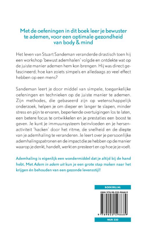 Goed ademen is een krachtige en altijd toegankelijke manier om stress en pijn te verminderen en je emoties onder controle te houden – met de oefeningen in dit boek leer je bewuster te ademen Het leven van Stuart Sandeman veranderde drastisch toen hij een workshop ‘bewust ademhalen’ volgde en ontdekte wat op de juiste manier ademen hem kon brengen. Hij was direct gefascineerd; hoe kan zoiets simpels en alledaags zo veel effect hebben op een mens? Sandeman leert je door middel van simpele, toegankelijke oefeningen en technieken op de juiste manier te ademen. Zijn methodes, die gebaseerd zijn op wetenschappelijk onderzoek, helpen je om dieper en langer te slapen, minder stress en pijn te ervaren, beperkende overtuigingen los te laten, een betere focus te ontwikkelen en je prestaties een boost te geven. Je kunt je immuunsysteem beïnvloeden en je hersenactiviteit ‘hacken’ door het ritme, de snelheid en de diepte van je ademhaling te veranderen. Je leert over je persoonlijke ademhalingspatronen en de impact die ze hebben op de manier waarop je denkt, handelt, werkt en presteert en op hoe je je voelt. Ademhaling is eigenlijk een wondermiddel dat je altijd bij de hand hebt. Met Adem in adem uit kun je een grote stap maken naar het krijgen én behouden van een gezonde levensstijl! In de pers ‘Dé ademhalingsexpert van de UK.’ Metro ‘Zijn methode zal ik de rest van mijn leven volgen.’ The Guardian ‘Ik was verbaasd over hoe goed zijn methode werkte.’ The Times
