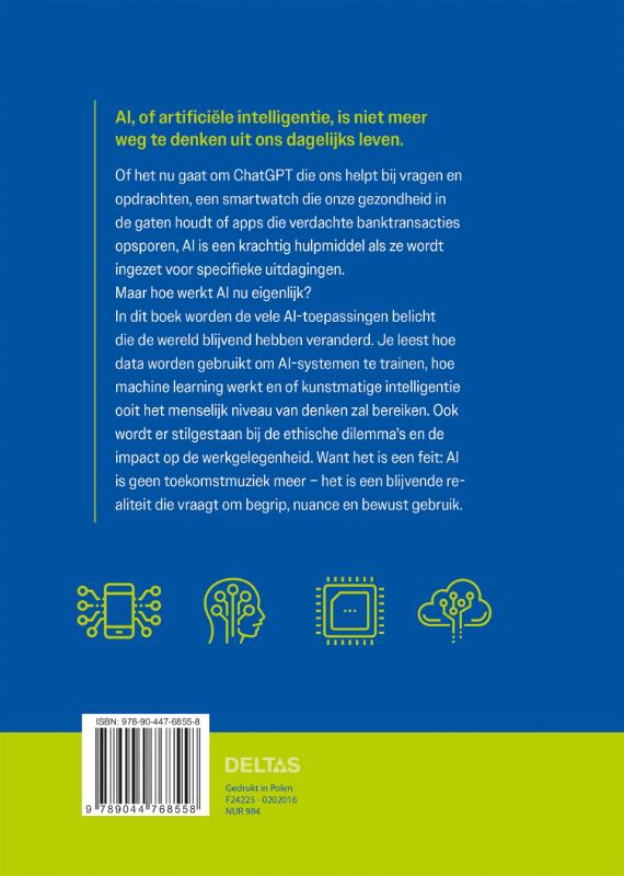 AI, of artificiële intelligentie, is niet meer weg te denken uit ons dagelijks leven. In dit begrijpelijke boek worden de belangrijkste begrippen en theorieën eenvoudig uitgelegd en de AI-toepassingen belicht die de wereld blijvend hebben veranderd. Je leest hoe data worden gebruikt om AI-systemen te trainen, hoe machine learning werkt en of kunstmatige intelligentie ooit het menselijk niveau van denken zal bereiken. Ook wordt er stilgestaan bij de ethische dilemma's en de impact op de werkgelegenheid. Want het is een feit: AI is geen toekomstmuziek meer - het is een blijvende realiteit die vraagt om begrip, nuance en bewust gebruik.