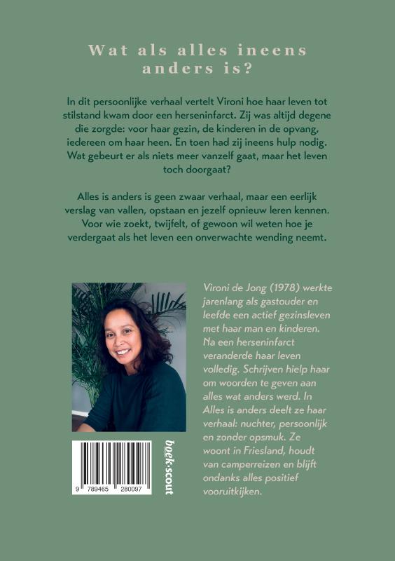 Wat als alles ineens anders is? In dit persoonlijke verhaal vertelt Vironi hoe haar leven tot stilstand kwam door een herseninfarct. Zij was altijd degene die zorgde: voor haar gezin, de kinderen in de opvang, iedereen om haar heen. En toen had zij ineens hulp nodig. Wat gebeurt er als niets meer vanzelf gaat, maar het leven toch doorgaat? Alles is anders is geen zwaar verhaal, maar een eerlijk verslag van vallen, opstaan en jezelf opnieuw leren kennen. Voor wie zoekt, twijfelt, of gewoon wil weten hoe je verdergaat als het leven een onverwachte wending neemt.