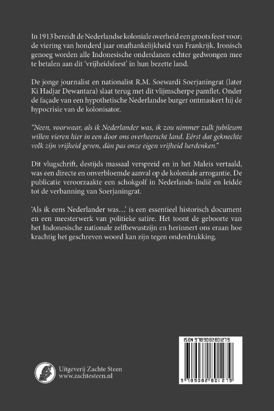 In 1913 bereidt de Nederlandse koloniale overheid een groots feest voor; de viering van honderd jaar onafhankelijkheid van Frankrijk. Ironisch genoeg worden alle Indonesische onderdanen echter gedwongen mee te betalen aan dit ‘vrijheidsfeest’ in hun bezette land. De jonge journalist en nationalist R.M. Soewardi Soerjaningrat (later Ki Hadjar Dewantara) slaat terug met dit vlijmscherpe pamflet. Onder de façade van een hypothetische Nederlandse burger ontmaskert hij de hypocrisie van de kolonisator. “Neen, voorwaar, als ik Nederlander was, ik zou nimmer zulk jubileum willen vieren hier in een door ons overheerscht land. Eérst dat geknechte volk zijn vrijheid geven, dàn pas onze eigen vrijheid herdenken.” Dit vlugschrift, destijds massaal verspreid en in het Maleis vertaald, was een directe en onverbloemde aanval op de koloniale arrogantie. De publicatie veroorzaakte een schokgolf in Nederlands-Indië en leidde tot de verbanning van Soerjaningrat. ‘Als ik eens Nederlander was…’ is een essentieel historisch document en een meesterwerk van politieke satire. Het toont de geboorte van het Indonesische nationale zelfbewustzijn en herinnert ons eraan hoe krachtig het geschreven woord kan zijn tegen onderdrukking.