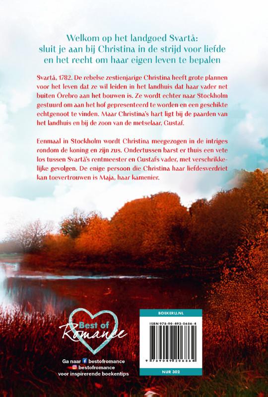 Een heerlijke romantische trilogie op het Downton Abbey van Zweden: het landgoed Svartå Svartå, 1782. De rebelse zestienjarige Christina heeft grote plannen voor het leven dat ze wil leiden in het landhuis dat haar vader net buiten Örebro aan het bouwen is. Ze wordt echter naar Stockholm gestuurd om aan het hof gepresenteerd te worden en een geschikte echtgenoot te vinden. Maar Christina’s hart ligt bij de paarden van het landhuis en bij de zoon van de metselaar, Gustaf. Eenmaal in Stockholm wordt Christina meegezogen in de intriges rondom de koning en zijn zus. Ondertussen barst er thuis een vete los tussen Svartå’s rentmeester en Gustafs vader, met verschrikkelijke gevolgen. De enige persoon die Christina haar liefdesverdriet kan toevertrouwen is Maja, haar kamenier. Goodreads-lezers over Als jij van mij was ‘De auteur geeft op een goede en kleurrijke manier het achttiende-eeuwse leven weer, waardoor het echt lijkt alsof je naar het verleden wordt getransporteerd.’ ***** Nina Hansson ‘Ik zat snel in het verhaal, de korte hoofdstukken verhogen het leestempo en ik verslond pagina na pagina terwijl ik wilde dat het boek nooit zou eindigen.’ ***** Boktanten ‘Perfect als je van historische romantiek met een feministische inslag houdt.’ ***** Christina A