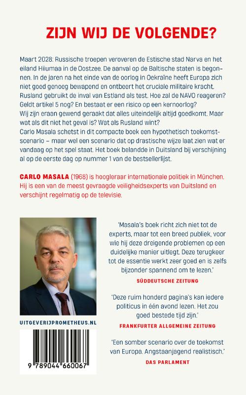 Zijn wij de volgende? Een beangstigend scenario van Carlo Masala Maart 2028: Russische troepen veroveren het Estische stadje Narva en het eiland Hiiumaa in de Oostzee. De aanval op de Baltische staten is begonnen. In de jaren na het einde van de oorlog in Oekraïne heeft Europa zich niet goed genoeg bewapend en ontbeert het cruciale militaire kracht. Rusland gebruikt de inval van Estland als test. Hoe zal de NAVO reageren? Geldt Artikel 5 nog? En bestaat er een risico op een kernoorlog? Wij zijn eraan gewend geraakt dat alles uiteindelijk altijd goedkomt. Maar wat als dit niet het geval is? Wat als Rusland wint? Carlo Masala schetst in dit compacte boek een hypothetisch toekomstscenario – maar wel een scenario dat op drastische wijze laat zien wat er vandaag op het spel staat. Het boek belandde in Duitsland bij verschijning al op de eerste dag op nummer 1 van de bestsellerlijst. Carlo Masala (1968) is hoogleraar internationale politiek in München. Hij is een van de meest gevraagde veiligheidsexperts van Duitsland en verschijnt regelmatig op de televisie. ‘Masala’s boek richt zich niet tot de experts, maar tot een breed publiek, voor wie hij deze dreigende problemen op een duidelijke manier uitlegt. Deze terugkeer tot de essentie en de literaire verwerking ervan werken zeer goed en zijn zelfs bijzonder spannend om te lezen.’ Süddeutsche Zeitung ‘Dit boek verdient een brede verspreiding. Deze ruim honderd pagina’s kan iedere politicus in één avond lezen. Het zou goed bestede tijd zijn.’ Frankfurter Allgemeine Zeitung ‘Een somber scenario over de toekomst van Europa. Angstaanjagend realistisch.’ Das Parlament