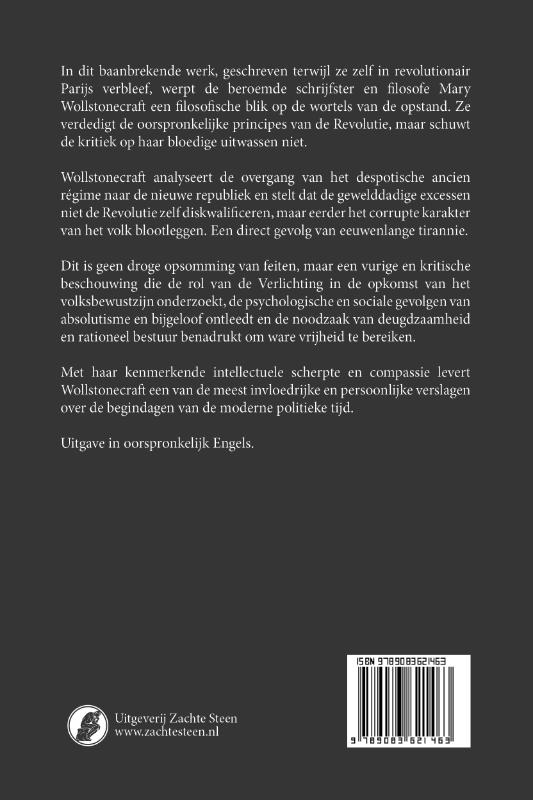 In dit baanbrekende werk, geschreven terwijl ze zelf in revolutionair Parijs verbleef, werpt de beroemde schrijfster en filosofe Mary Wollstonecraft een filosofische blik op de wortels van de opstand. Ze verdedigt de oorspronkelijke principes van de Revolutie, maar schuwt de kritiek op haar bloedige uitwassen niet. Wollstonecraft analyseert de overgang van het despotische ancien régime naar de nieuwe republiek en stelt dat de gewelddadige excessen niet de Revolutie zelf diskwalificeren, maar eerder het corrupte karakter van het volk blootleggen. Een direct gevolg van eeuwenlange tirannie. Dit is geen droge opsomming van feiten, maar een vurige en kritische beschouwing die de rol van de Verlichting in de opkomst van het volksbewustzijn onderzoekt, de psychologische en sociale gevolgen van absolutisme en bijgeloof ontleedt en de noodzaak van deugdzaamheid en rationeel bestuur benadrukt om ware vrijheid te bereiken. Met haar kenmerkende intellectuele scherpte en compassie levert Wollstonecraft een van de meest invloedrijke en persoonlijke verslagen over de begindagen van de moderne politieke tijd. Uitgave in oorspronkelijk Engels.