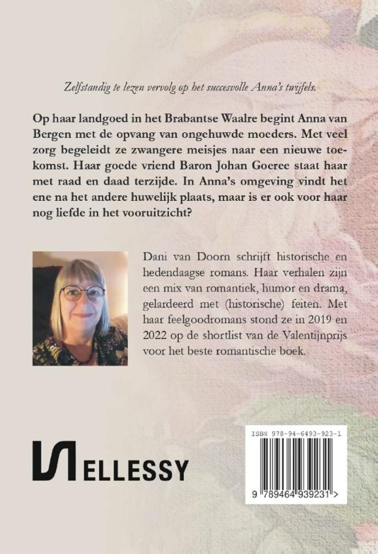 Zelfstandig te lezen vervolg op het succesvolle Anna’s twijfels. Op haar landgoed in het Brabantse Waalre begint Anna van Bergen met de opvang van ongehuwde moeders. Met veel zorg begeleidt ze zwangere meisjes naar een nieuwe toekomst. Haar goede vriend Baron Johan Goeree staat haar met raad en daad terzijde. In Anna's omgeving vindt het ene na het andere huwelijk plaats, maar is er ook voor haar nog liefde in het vooruitzicht? Dani van Doorn schrijft historische en hedendaagse romans. Haar verhalen zijn een mix van romantiek, humor en drama, gelardeerd met (historische) feiten. Met haar feelgoodromans stond ze in 2019 en 2022 op de shortlist van de Valentijnprijs voor het beste romantische boek.