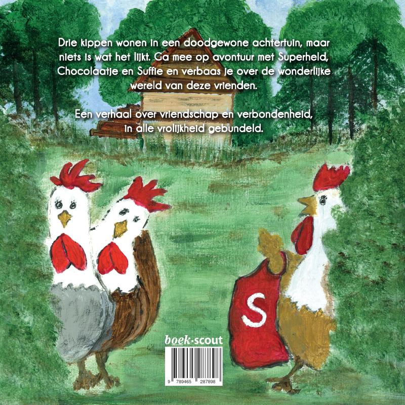 Drie kippen wonen in een doodgewone achtertuin, maar niets is wat het lijkt. Ga mee op avontuur met Superheld, Chocolaatje en Suffie en verbaas je over de wonderlijke wereld van deze vrienden. Een verhaal over vriendschap en verbondenheid, in alle vrolijkheid gebundeld.