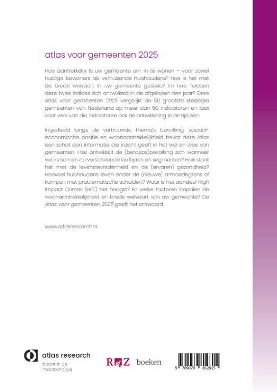 Atlas voor gemeenten 2025 vergelijkt de 50 grootste gemeenten van Nederland op meer dan 50 indicatoren en laat hierin ook de ontwikkeling in de tijd zien. De woonaantrekkelijkheidsindex en de bredewelvaartsindex krijgen ook volop aandacht. ISBN 9789079812615.