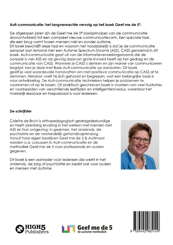 Auti-communicatie: het langverwachte vervolg op het boek Geef me de 5®. De afgelopen jaren zijn de Geef me de 5® basisprincipes van de communicatie doorontwikkeld tot een compleet nieuwe communicatievorm. Een speciale taal, die een brug vormt tussen mensen mèt en zonder autisme. Dit boek beschrijft deze taal en waarom het noodzakelijk is dat je de communicatie aanpast aan iemand met een Autisme Spectrum Stoornis (ASS), CASS genoemd in dit boek. Auti-communicatie gaat uit van de informatieverwerkingsstoornis die de oorzaak is van ASS en als gevolg daarvan grote invloed heeft op het gedrag en de communicatie van CASS. Wanneer je CASS’s denken en zijn manier van communiceren begrijpt, kan je daar met Basis Auti-communicatie op aansluiten. Dit boek geeft je veel waardevolle handvatten om met positieve communicatie op CASS af te stemmen. Hierdoor voelt hij zich gehoord en begrepen, wat een belangrijke basis is voor ontwikkeling. De Auti-communicatie technieken helpen je problemen te voorkomen of op te lossen. Dit praktisch geschreven boek is voorzien van veel illustraties en voorbeelden van verschillende leeftijden en intelligentieniveaus, waardoor het makkelijk leesbaar en toepasbaar is voor iedereen. De schrijfster Colette de Bruin is orthopedagogisch gedragsdeskundige en heeft jarenlang ervaring in het werken met mensen met ASS en hun omgeving: in gezinnen, het onderwijs, de psychiatrie en de verstandelijk gehandicaptenzorg. Vanuit haar eigen bedrijven Geef me de 5 & Autimaat worden o.a. cursussen in Auti-communicatie en de methodiek Geef me de 5 voor professionals en ouders gegeven. Dit boek is een aanrader voor iedereen die werkt in het onderwijs, de zorg of psychiatrie en beslist ook voor ouders en mensen met autisme.