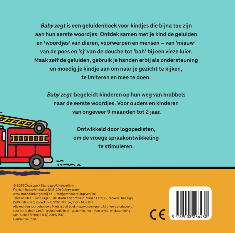 Baby zegt is een geluidenboek voor kindjes die bijna toe zijn aan hun eerste woordjes. Ontdek samen met je kind de geluiden en ‘woordjes’ van dieren, voorwerpen en mensen – van ‘miauw’ van de poes en ‘sj’ van de douche tot ‘bah’ bij een vieze luier. Maak zelf de geluiden, gebruik je handen erbij als ondersteuning en moedig je kindje aan om naar je gezicht te kijken, te imiteren en mee te doen. Baby zegt begeleidt kinderen op hun weg van brabbels naar de eerste woordjes. Voor ouders en kinderen van ongeveer 9 maanden tot 2 jaar. Ontwikkeld door logopedisten, om de vroege spraakontwikkeling te stimuleren.