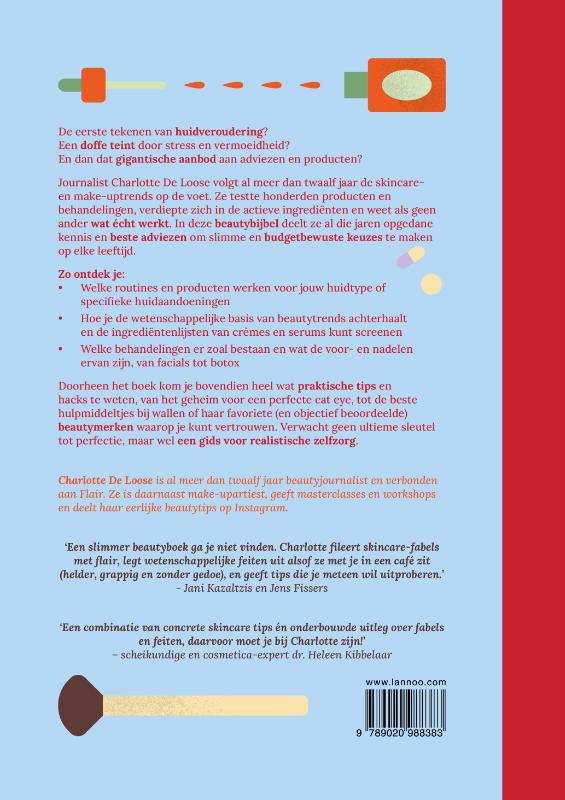 De eerste tekenen van huidveroudering? Een doffe teint door stress en vermoeidheid? En dan dat gigantische aanbod aan adviezen en producten? Journalist Charlotte De Loose volgt al meer dan twaalf jaar de skincare- en make-uptrends op de voet. Ze testte honderden producten en behandelingen, verdiepte zich in de actieve ingrediënten en weet als geen ander wat écht werkt. In deze beautybijbel deelt ze al die jaren opgedane kennis en beste adviezen om slimme en budgetbewuste keuzes te maken op elke leeftijd. Zo ontdek je: Welke routines en producten werken voor jouw huidtype of specifieke huidaandoeningen Hoe je de wetenschappelijke basis van beautytrends achterhaalt en de ingrediëntenlijsten van crèmes en serums kunt screenen Welke behandelingen er zoal bestaan en wat de voor- en nadelen ervan zijn, van facials tot botox Doorheen het boek kom je bovendien heel wat praktische tips en hacks te weten, van het geheim voor een perfecte cat eye, tot de beste hulpmiddeltjes bij wallen of haar favoriete (en objectief beoordeelde) beautymerken waarop je kunt vertrouwen. Verwacht geen ultieme sleutel tot perfectie, maar wel een gids voor realistische zelfzorg. 'Een slimmer beautyboek ga je niet vinden. Charlotte fileert skincare-fabels met flair, legt wetenschappelijke feiten uit alsof ze met je in een café zit (helder, grappig en zonder gedoe), en geeft tips die je meteen wil uitproberen.' - Jani Kazaltzis en Jens Fissers 'Een combinatie van concrete skincare tips én onderbouwde uitleg over fabels en feiten, daarvoor moet je bij Charlotte zijn!' - scheikundige en cosmetica-expert Heleen Kibbelaar