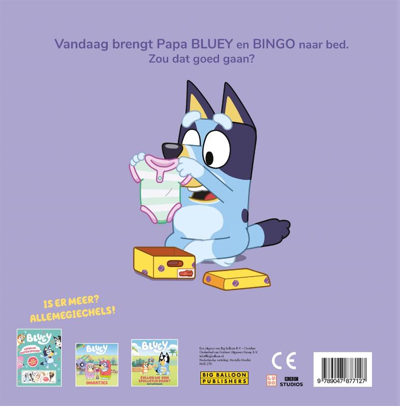 In het nieuwste Bluey-prentenboek, ‘Bedtijd met Papa’, gaat Mama naar een babyshower, dus brengt magnifieke spelleider Papa Bluey en Bingo naar bed. De vraag is natuurlijk of dat wel goed zal gaan… Bluey is een lieve en energieke puppy die samen met haar zusje Bingo en hun vader en moeder woont. Door haar eindeloze energie en fantasie beleeft ze bijzondere avonturen en wordt er veel gespeeld en gelachen met haar vrienden en familie. Bluey is een Australische animatieserie voor kleuters. De serie is een wereldwijde hit waar zowel boekuitgaven als speelgoed heel goed verkopen. Bluey wordt gezien als de tweede Peppa Pig. De serie wordt in Nederland en België uitgezonden op Disney Channel en Disney+.