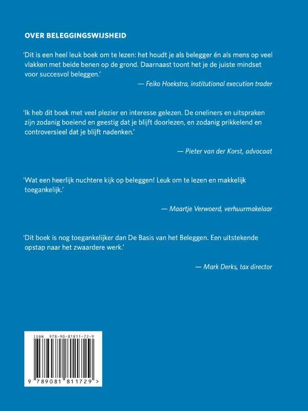 BELEGGINGSWIJSHEID is een verzameling leuke, leerzame, en verhelderende inzichten van de beste beleggers ter wereld. Belangrijke beleggingsvragen als: hoe reageren de beste beleggers ter wereld op veranderende beurskoersen, hoe gaan zij daarbij om met hun emoties, en wanneer kopen en verkopen zij hun beleggingen? Op al die vragen en meer vindt u de antwoorden in dit makkelijke en toegankelijke beleggingsboekje voor de beginnende en ervaren belegger. Een boekje met veel wijsheden zonder rekensommen. In acht hoofdstukken, ieder voorzien van een heldere inleiding, neemt BELEGGINGSWIJSHEID u mee in de ervaringen, inzichten, en fouten van de de beste beleggers ter wereld (waaronder de wereldberoemde beleggers Warren Buffett, George Soros, Carlos Slim, Peter Lynch, John Templeton en vele anderen). Zo biedt BELEGGINGSWIJSHEID u een scherpe, leerzame, en heldere blik op de basisbeginselen van verstandig en succesvol beleggen. De verhelderende inleidingen en de waardevolle citaten in dit beleggingsboek hebben één duidelijk gemeenschappelijke boodschap: er is maar één iemand die met hart en verstand voor uw geld zal zorgen, en dat bent uzelf.
