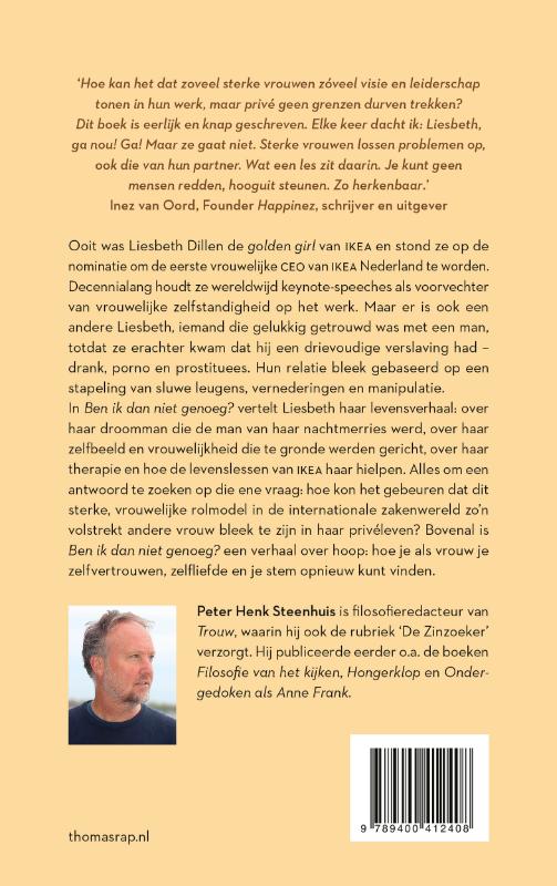 Ooit was Liesbeth Dillen the golden girl van IKEA en stond ze op de nominatie om de eerste vrouwelijke ceo van IKEA Nederland te worden. Decennialang houdt ze wereldwijd keynote speeches als voorvechter van vrouwelijke zelfstandigheid op het werk.. Maar er is ook een andere Liesbeth, iemand die gelukkig getrouwd was met een man, totdat ze erachter kwam dat hij een drievoudige verslaving had – drank, porno en prostituees. Hun relatie bleek opgebouwd uit een stapeling van sluwe leugens, vernederingen en manipulatie. In Ben ik dan niet genoeg? vertelt Liesbeth haar levensverhaal: over haar droomman die de man van haar nachtmerries werd, over haar zelfbeeld en vrouwelijkheid die te gronde werden gericht, over haar therapie en hoe de levenslessen van IKEA haar hielpen. Alles om een antwoord te zoeken op die ene vraag: hoe kon het gebeuren dat dit sterke, vrouwelijke rolmodel in de internationale zakenwereld zo’n volstrekt andere vrouw bleek te zijn in haar privéleven? Bovenal is Ben ik dan niet genoeg? een verhaal over hoop: hoe je als vrouw je zelfvertrouwen, zelfliefde en je stem opnieuw kunt vinden.
