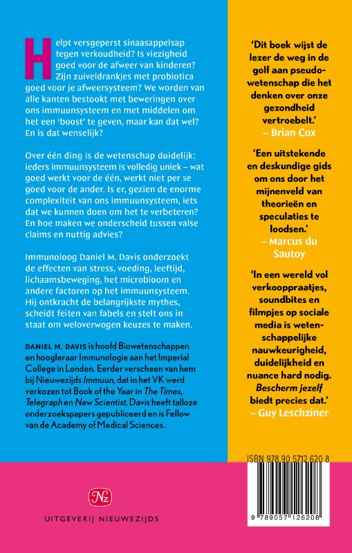 Helpt versgeperst sinaasappelsap tegen verkoudheid? Is viezigheid goed voor de afweer van kinderen? Zijn zuiveldrankjes met probiotica goed voor je afweersysteem? We worden van alle kanten bestookt met beweringen over ons immuunsysteem en met middelen om het een ‘boost’ te geven, maar kan dat wel? En is dat wenselijk? Over één ding is de wetenschap duidelijk: ieders immuunsysteem is volledig uniek – wat goed werkt voor de één, werkt niet per se goed voor de ander. Is er, gezien de enorme complexiteit van ons immuunsysteem, iets dat we kunnen doen om het te verbeteren? En hoe maken we onderscheid tussen valse claims en nuttig advies? Immunoloog Daniel M. Davis onderzoekt de effecten van stress, voeding, leeftijd, lichaamsbeweging, het microbioom en andere factoren op het immuunsysteem. Hij ontkracht de belangrijkste mythes, scheidt feiten van fabels en stelt ons in staat om weloverwogen keuzes te maken. Daniel M. Davis is hoofd Biowetenschappen en hoogleraar Immunologie aan het Imperial College in Londen. Eerder verscheen van hem bij Nieuwezijds Immuun , dat in het VK werd verkozen tot Book of the Year in The Times , Telegraph en New Scientist . Davis heeft talloze onderzoekspapers gepubliceerd en is Fellow van de Academy of Medical Sciences. ‘Buitengewoon boeiend. Bijna elke alinea bevat een openbaring.’ – Bill Bryson ‘Dit boek wijst de lezer de weg in de golf aan pseudowetenschap die het denken over onze gezondheid vertroebelt.’ – Brian Cox ‘Een uitstekende en deskundige gids om ons door het mijnenveld van theorieën en speculaties te loodsen.’ – Marcus du Sautoy ‘In een wereld vol verkooppraatjes, soundbites en filmpjes op sociale media is wetenschappelijke nauwkeurigheid, duidelijkheid en nuance hard nodig. Bescherm jezelf biedt precies dat.’ – Guy Leschziner