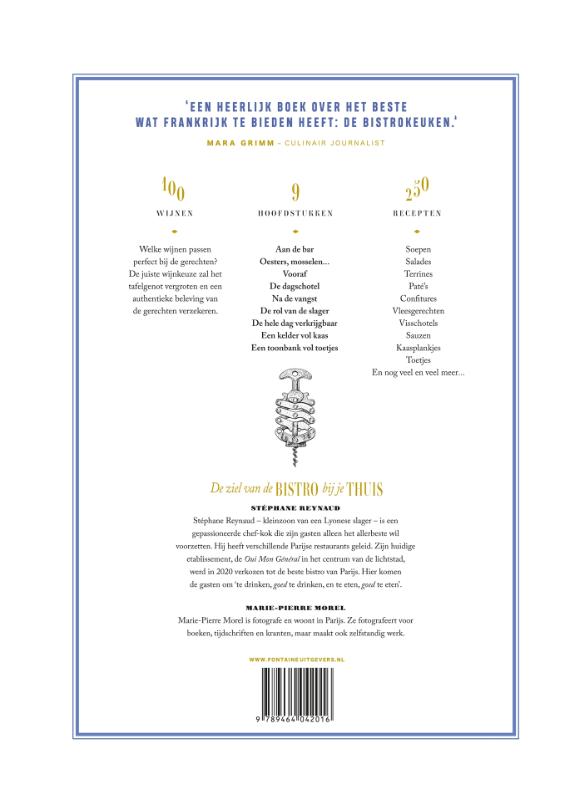Een ode aan hét culinaire instituut van Frankrijk De bistro, baken van de hongerigen. Een Frans instituut pur sang dat het midden houdt tussen een restaurant en café. Een van zijn beroemdste vertegenwoordigers, Stéphane Reynaud, deelt in Bistrotier 250 recepten om van te smullen. Wat dacht u van must-eats als steak tartare, escargots, mayo-eitjes, terrines, oesters, steak frites, boeuf Bourguignon, rillettes met brood en uiensoep? Ook diverse stoofschotels, terrines, kaasplateaus en natuurlijk desserts als crème brûlée en île flottante komen in het boek aan bod. Maar er is meer! Zo vindt u in Bistrotier een kaart met de belangrijkste oesterteeltgebieden en alles wat u moet weten over aperitieven, bier en koffie. Uiteraard worden de wijnen niet vergeten: maar liefst 100 komen er aan bod en je leest exact welke wijn bij welk gerecht past. Bistrotier is een prachtig vormgegeven en met zorg gemaakt gebonden boek, vol foto's en tekeningen, waarvan elke kookboekengek gaat knorren van plezier. 'Prachtig boek voor de echte Francofiel. Een poëtische lofzang op het Franse café-restaurantleven inclusief álle bekende klassieke recepten.' Karin Luiten 'De kookboekengrootheid Stephane Reynaud staat altijd borg voor goed onderlegde boeken, met veel creativiteit en kennis, puike fotografie en vormgeving.' Bouillon Magazine 'Bent u bekend met de veelvoorkomende dagdroom om stapel verliefd te worden op een wildvreemde, waarna u met uw nieuwe geliefde op het eerste vliegtuig richting een tropisch eiland stapt om elkaar daar onbekommerd te kunnen beminnen? Iets vergelijkbaars had ik met dit boek.' Marcus Huibers in de Volkskrant over Patés en pasteien (2014) 'Voor de prijs van een daluren enkeltje TGV brengt Bistrotier de voortreffelijke bistrokeuken gewoon bij je thuis.' WineLife 'De Franse keuken stelt nooit teleur. De Franse bistro is een plek van alledag. Een plek waar wordt geleefd. Een soort huiskamer, maar dan van ons allemaal.' - Foodies 'Een liefdesverklaring aan de bistro. [...] Vol verhalen en gerechten en grappen. Want dat is Reynaud.' Jacques Hermus, Noord-Hollands Dagblad 'Niet geschikt voor vegetariërs, wel voor alle liefhebbers van de klassieke Franse bistrogerechten en daar ben ik er dus een van. In Bistrotier blijft het niet alleen bij recepten, Reynaud geeft er ook wijnadviezen bij. Wat willen we nog meer?!' - Jonah Freud, het Parool 'Prachtig geïllustreerd' Côte & Provence