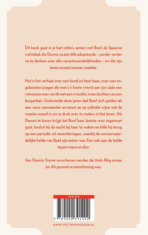 Dit boek gaat in je hart zitten, samen met Boef, de Spaanse vuilnisbak die Dennis na één blik adopteerde – zonder verder na te denken over alle verantwoordelijkheden – en die zijn leven zoveel mooier maakte. Het is het verhaal over een hond en zijn baas, over een ongebonden jongen die met z'n beste vriend aan zijn zijde een volwassen man wordt met een vriendin, twee dochters en een burgerbak. Gedurende deze jaren laat Boef zich gelden als een ware zenmeester en toont op subtiele wijze wat de moeite waard is om je druk over te maken in het leven. Als Dennis te horen krijgt dat Boef haar laatste uren tegemoet gaat, besluit hij de nacht bij haar te waken en blikt hij terug op een periode vol veranderingen, waarbij de onvoorwaardelijke liefde van Boef zijn anker was. Een ode aan de liefde tussen mens en dier. Dennis Storm (1985) reisde van 2006 tot en met 2016 de wereld over voor zijn werk als programmamaker en presentator van verschillende reisseries. Hij is een groot liefhebber van architectuur en minimalisme en schreef eerder voor Spectrum over de schoonheid van deze onderwerpen en wat ze voor ons kunnen betekenen bij het omarmen van een groene toekomst.