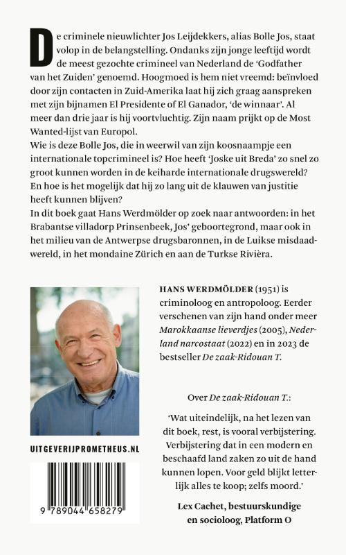 De criminele nieuwlichter Jos Leijdekkers, alias Bolle Jos, staat volop in de belangstelling. Ondanks zijn jonge leeftijd wordt de meest gezochte crimineel van Nederland de ‘Godfather van het Zuiden’ genoemd. Hoogmoed is hem niet vreemd: beïnvloed door zijn contacten in Zuid-Amerika laat hij zich graag aanspreken met zijn bijnamen El Presidente of El Ganador, ‘de winnaar’. Al meer dan drie jaar is hij voortvluchtig. Zijn naam prijkt op de Most Wanted-lijst van Interpol. Wie is deze Bolle Jos, die in weerwil van zijn koosnaampje een internationale topcrimineel is? Hoe heeft ‘Joske uit Breda’ zo snel zo groot kunnen worden in de keiharde internationale drugswereld? En hoe is het mogelijk dat hij zo lang uit de klauwen van justitie heeft kunnen blijven? In dit boek gaat Hans Werdmölder op zoek naar antwoorden: in het Brabantse villadorp Prinsenbeek, Jos’ geboortegrond, maar ook in het milieu van de Antwerpse drugsbaronnen, in de Luikse misdaadwereld, in het mondaine Zürich en aan de Turkse Rivièra. Hans Werdmölder (1951) is criminoloog en antropoloog. Eerder verschenen van zijn hand onder meer Marokkaanse lieverdjes (2005), Nederland narcostaat (2022) en in 2023 de bestseller De zaak-Ridouan T. Over De zaak-Ridouan T.: ‘De kracht van Werdmölders boek ligt vooral in de heldere manier waarop hij nog eens op een rij zet wat er allemaal gebeurd is en hoe de vele incidenten met elkaar samenhangen. Wat uiteindelijk, na het lezen van dit boek, rest, is vooral verbijstering. Verbijstering dat in een modern en beschaafd land zaken zo uit de hand kunnen lopen. Criminele afrekeningen blijven niet meer beperkt tot de criminele onderwereld. Voor geld blijkt letterlijk alles te koop; zelfs moord.’ Lex Cachet, bestuurskundige en socioloog, Platform O
