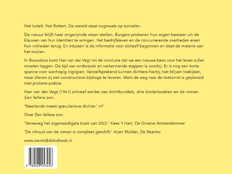 De natuur blijft onhaalbare eisen stellen. Individuen leveren een strijd om de macht met hun identiteit. Het bedrijfsleven en de concurrerende overheden willen hun vrijheden terug. En intussen is de informatie voor zichzelf begonnen en slaat de materie aan het rebelleren. In Bouwdoos komt Han van der Vegt tot de conclusie dat we een nieuwe basis voor het leven zullen moeten leggen. De tijd van onderzoek en verkennende stappen is voorbij. Er is nog een korte spanne voor wanhopig ingrijpen. Vanzelfsprekend kunnen dichters hierbij niet blijven toekijken, maar dienen zij een constructieve bijdrage te leveren. Want de weg naar de toekomst is geplaveid met probate poëzie. ‘Werd de poëzie maar vaker bezocht door zoveel pretentie.’ Ilja Leonard Pfeijffer over Exorbitans