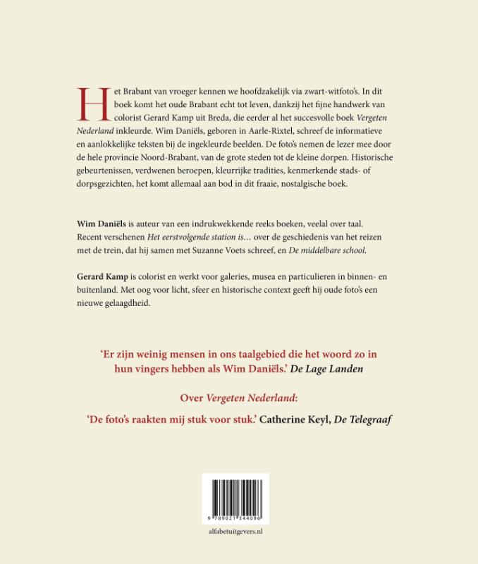Het Brabant van vroeger kennen we hoofdzakelijk via zwart-witfoto’s. In dit boek komt het oude Brabant echt tot leven, dankzij het fijne handwerk van colorist Gerard Kamp uit Breda, die eerder al het succesvolle boek Vergeten Nederland inkleurde. Opperbrabander Wim Daniëls schreef de informatieve en aanlokkelijke teksten bij de ingekleurde beelden. De foto’s nemen de lezer mee door de hele provincie Noord-Brabant, van de grote steden tot de kleine dorpjes. Historische gebeurtenissen, verdwenen beroepen, kleurrijke tradities, kenmerkende stads- of dorpsgezichten, het komt allemaal aan bod in dit fraaie, nostalgische cadeauboek.