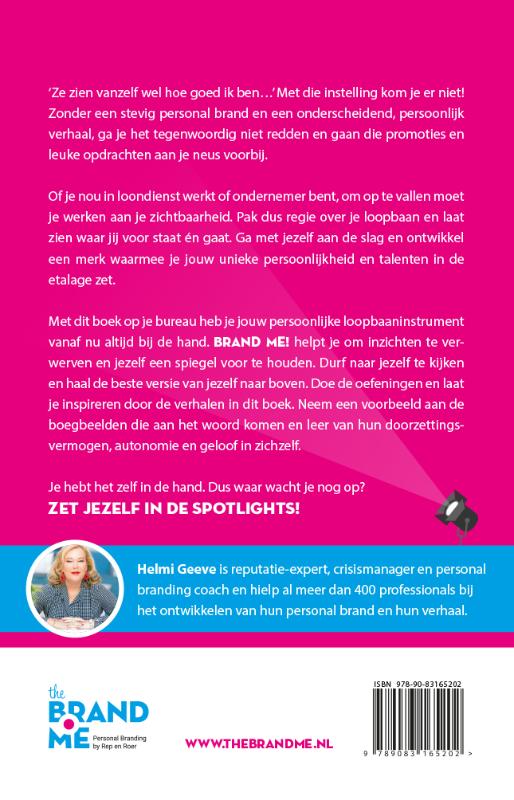 'Ze zien wel hoe goed ik ben...' Met die instelling kom je er niet! Zonder een stevig personal brand en een onderscheidend, persoonlijk verhaal, ga je het tegenwoordig niet redden en gaan die promoties en leuke opdrachten aan je neus voorbij. Of je nou in loondienst werkt of ondernemer bent, om op te vallen moet je werken aan je zichtbaarheid. Pak dus regie op je loopbaan en laat zien waar jij voor gaat en staat. ga met jezelf aan de slag en ontwikkel een merk waarmee je jouw unieke persoonlijkheid en talenten in de etalage zet. Met dit boek op je bureau heb je jouw persoonlijke loopbaaninstrument vanaf nu altijd bij de hand. Brand Me! helpt je om inzichten te verwerven en jezelf een spiegel voor te houden. Durf naar jezelf te kijken en haal de beste versie van jezelf naar boven. Doe de oefeningen en laat je inspireren door de verhalen in dit boek. Neem een voorbeeld aan de boegbeelden die aan het woord komen en leer van hun doorzettingsvermogen, autonomie en geloof in zichzelf. Je hebt het zelf in de hand. Dus waar wacht je nog op? Zet jezelf in de spotlights! Helmi Geeve is reputatie-expert, crisismanager en personal branding coach en hielp al meer dan 400 professionals bij het ontwikkelen van hun personal brand en hun verhaal.
