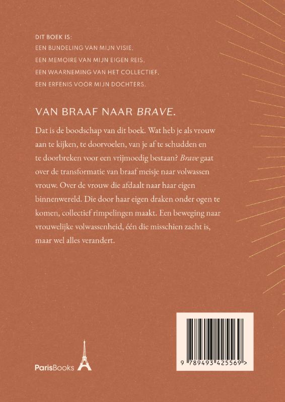 DIT BOEK IS: EEN BUNDELING VAN MIJN VISIE, EEN MEMOIRE VAN MIJN EIGEN REIS, EEN WAARNEMING VAN HET COLLECTIEF, EEN ERFENIS VOOR MIJN DOCHTERS. VAN BRAAF NAAR BRAVE. Dat is de boodschap van dit boek. Wat heb je als vrouw aan te kijken, te doorvoelen, van je af te schudden en te doorbreken voor een vrijmoedig bestaan? Brave gaat over de transformatie van braaf meisje naar volwassen vrouw. Over de vrouw die afdaalt naar haar eigen binnenwereld. Die door haar eigen draken onder ogen te komen, collectief rimpelingen maakt. Een beweging naar vrouwelijke volwassenheid, één die misschien zacht is, maar wel alles verandert. Madelon Lutgert - Plante ParisBooks