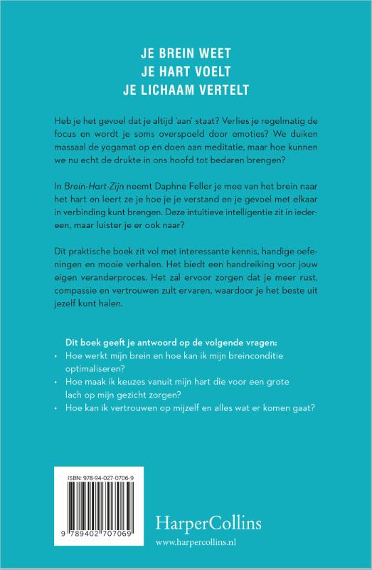 Hersenexpert Daphne Feller legt uit hoe je de rust in jezelf vindt. Heb je het gevoel dat je altijd ‘aan’ staat? Verlies je regelmatig de focus en word je soms overspoeld door emoties? We duiken massaal de yogamat op en doen aan meditatie, maar hoe kunnen we nu echt de drukte in ons hoofd tot bedaren brengen? In Brein-Hart-Zijn neemt Daphne Feller je mee van het brein naar het hart en leert ze je hoe je je verstand en je gevoel met elkaar in verbinding kunt brengen. Deze intuïtieve intelligentie zit in iedereen, maar luister je er ook naar? Dit praktische boek zit vol met interessante kennis, handige oefeningen en mooie verhalen. Het biedt een handreiking voor jouw eigen veranderproces. Het zal ervoor zorgen dat je meer rust, compassie en vertrouwen zult ervaren, waardoor je het beste uit jezelf kunt halen. ‘Met Brein-Hart-Zijn krijg je een handige toolkit vol met technieken voor zowel hoofd én hart. Aanrader!’ – Wouter de Jong, auteur van Mindgym: Sportschool voor je geest JE BREIN WEET. JE HART VOELT. JE LICHAAM VERTELT. 'Daphne kan als geen ander complexe materie over de werking van ons brein op een toegankelijke manier uitleggen.' Karlijn Visser, oprichter Holistik 'Het brein complex? Niet als je Daphne Feller aan het woord laat. Ze maakt wetenschap toegankelijk, toepasbaar en fun!' Milou Turpijn, hoofdredacteur Women's Health Magazine ‘Daphne Feller is erin geslaagd een complex verhaal simpel uit te leggen en daardoor voor iedereen toegankelijk te maken.’ Managementboek