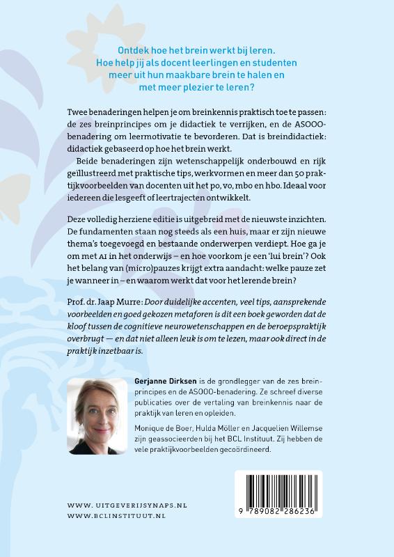 Ontdek hoe het brein werkt bij leren en hoe je als docent leren leuker én effectiever maakt. Breindidactiek is al jaren een klassieker op de literatuurlijsten van pedagogische en didactische opleidingen in Nederland en België — nu volledig vernieuwd. — Twee benaderingen helpen je breinkennis praktisch toe te passen: de zes breinprincipes om je didactiek te verrijken en de ASOOO-benadering om leermotivatie te bevorderen. Dat is breindidactiek: didactiek gebaseerd op hoe het brein werkt. Beide benaderingen zijn wetenschappelijk onderbouwd en rijk geïllustreerd met praktische tips, werkvormen en meer dan 50 praktijkvoorbeelden van docenten uit het po, vo, mbo en hbo. Ideaal voor iedereen die lesgeeft, traint of leertrajecten ontwikkelt. — Deze volledig herziene editie is uitgebreid met de nieuwste inzichten. De fundamenten staan nog steeds als een huis, maar er zijn ook nieuwe thema’s toegevoegd en bestaande onderwerpen verdiept. Hoe ga je bijvoorbeeld om met AI in het onderwijs — en hoe voorkom je dat dit leidt tot een ‘lui brein’? Ook het belang van (micro)pauzes krijgt extra aandacht, met praktische handvatten over welke pauze je wanneer inzet — en waarom dat werkt voor het lerende brein. — Prof. dr. Jaap Murre: “Door duidelijke accenten, veel tips, aansprekende voorbeelden en goed gekozen metaforen is dit een boek geworden dat de kloof tussen de cognitieve neurowetenschappen en de beroepspraktijk overbrugt — en dat niet alleen leuk is om te lezen, maar ook direct in de praktijk inzetbaar is.” — Gerjanne Dirksen is de grondlegger van de zes breinprincipes en de ASOOO-benadering. Ze schreef diverse publicaties over de vertaling van breinkennis naar de praktijk van leren en opleiden.