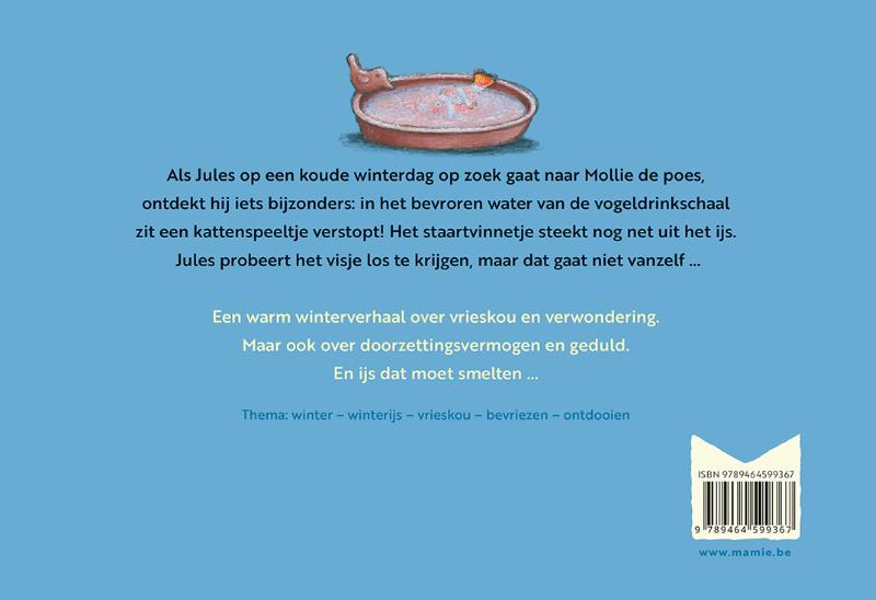 Als Jules op een koude winterdag op zoek gaat naar Mollie de poes, ontdekt hij iets bijzonders: in het bevroren water van de vogeldrinkschaal zit een kattenspeeltje verstopt! Het staartvinnetje steekt nog net uit het ijs. Jules probeert het visje los te krijgen, maar dat gaat niet vanzelf … Een warm winterverhaal over vrieskou en verwondering. Maar ook over doorzettingsvermogen en geduld. En ijs dat moet smelten … Thema: winter – winterijs – vrieskou – bevriezen – ontdooien