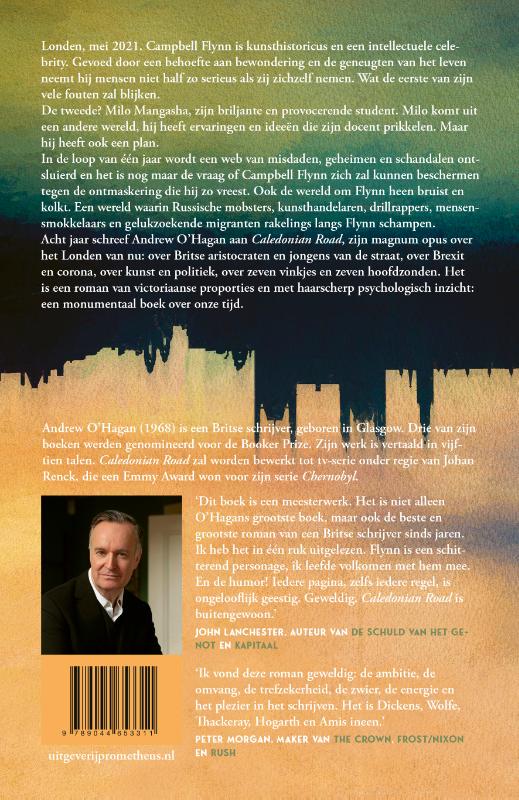 Londen, mei 2021. Campbell Flynn, kunsthistoricus en intellectuele celebrity, betreedt het rijk van de middelbare leeftijd. Gevoed door een behoefte aan bewondering en de fijnere dingen van het leven neemt hij mensen niet half zo serieus als zij zichzelf nemen. Hetgeen de eerste van zijn vele fouten zal blijken. De tweede? Milo Manghasa, zijn briljante en provocerende student. Milo komt uit een onbekende en onzekere wereld, hij heeft ervaringen en ideeën die zijn docent prikkelen. Maar hij heeft ook een plan. In de loop van een gevaarlijk jaar zal een web van misdaden, geheimen en schandalen aan het licht komen, en Campbell Flynn zal zichzelf misschien niet kunnen beschermen tegen de verpletterende ontmaskering van alle privileges die hij bezit. Maar hij wist het altijd al: als zijn leven zou instorten, zou dat in de openbaarheid plaatsvinden. Acht jaar schreef Andrew O’Hagan aan Caledonian Road, zijn magnum opus: een roman over rijken en armen, bevoorrechten en achtergestelden, mensen mét en zonder moreel besef. Het is een roman van victoriaanse proporties en onbetwistbaar een monumentaal boek voor onze tijd. Andrew O’Hagan (1968) is een Schotse schrijver die tot de belangrijkste stemmen van zijn generatie wordt gerekend. Drie van zijn boeken werden genomineerd voor de Booker Prize en hij won verschillende literaire prijzen, waaronder de Christopher Isherwood Prize voor zijn laatste roman Mayflies. Zijn werk is vertaald in vijftien talen. Caledonian Road zal worden bewerkt tot tv-serie onder regie van Johan Renck, die een Emmy Award won voor zijn serie Chernobyl. ‘Het is niet alleen O’Hagans grootste boek, maar ook de beste en grootste roman die iemand sinds tijden in ons land geschreven heeft. (…) Niet alleen regel voor regel, maar pagina voor pagina is het hilarisch grappig. Geweldig. Caledonian Road is buitengewoon.’ John Lanchester, auteur van De schuld van het genot en kapitaal ‘Andrew O’Hagan heeft met dit magnum opus meer gemaakt dan alleen een geweldig boek; hij heeft een sociaal wonder geschapen.’ Joshua Cohen, winnaar van de Pulitzerprijs voor The netanyahus ‘Ik vond deze roman geweldig: de ambitie, de omvang, de trefzekerheid, de zwier, de energie en het plezier in het schrijven. Het is Dickens en Wolfe en Thackeray en Hogarthen Amis.’ Peter Morgan, maker van The crown, Frost/nixon en Rush