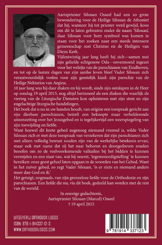 Aartspriester Silouan Osseel had een zo grote bewondering voor de Heilige Silouan de Athoniet dat hij, wanneer hij tot priester werd gewijd, koos om dit te laten gebeuren onder de naam ‘Silouan’, daar Silouan voor hem symbool was komen te staan voor het zoeken naar een steeds intensere gemeenschap met Christus en de Heiligen van Diens Kerk. Vijfentwintig jaar lang heeft hij zich-samen met zijn geliefde echtgenote Oda-onvermoeid ingezet voor het welzijn van de parochianen van Eindhoven, en tot op de laatste dagen van zijn aardse leven bleef Vader Silouan zich verantwoordelijk voelen voor zijn geestelijk kind: zijn parochie van de Heilige Nektarios van Aegina. 10 jaar lang was hij daar diaken en hij wordt, sinds zijn ontslapen in de Heer op zondag 19 april 2015, nog altijd herinnerd als een diaken die waarlijk de viering van de Liturgische Diensten kon opluisteren met zijn stem en zijn engelachtige liturgische handelingen. Het boek dat u nu in uw handen houdt, van origine een toespraak gericht aan zijn dierbare parochianen, betreft een beknopte maar verhelderende uiteenzetting over het Jezusgebed en is tegelijkertijd een weerspiegeling van zijn toewijding en liefde. Want hoewel dit korte gebed nagenoeg niemand vreemd is, wilde Vader Silouan zich er met deze toespraak van verzekeren dat zijn parochianen zich niet alleen volledig bewust zouden zijn van de werkelijke betekenis ervan, maar ook met name dat zij het naar behoren en doorgedreven zouden beoefen om zo de veelvoorkomende valkuilen bij het bidden te kunnen vermijden en een staat van, wat hij noemt, ‘tegenwoordigstelling’ te kunnen bereiken: onze geest geheel laten opgaan in de woorden van het Gebed. Want in het zuiver gebed, zo zegt Vader Silouan, ‘is er niets en niemand anders meer dan God en ik.’ Het getuigt, nogmaals, van zijn grenzeloze liefde voor de Orthodoxie en zijn parochianen. Een liefde die nu, via dit boek, gedeeld kan worden met de rest van de wereld. In eeuwige gedachtenis, Aartspriester Silouan Osseel 19 april 2015