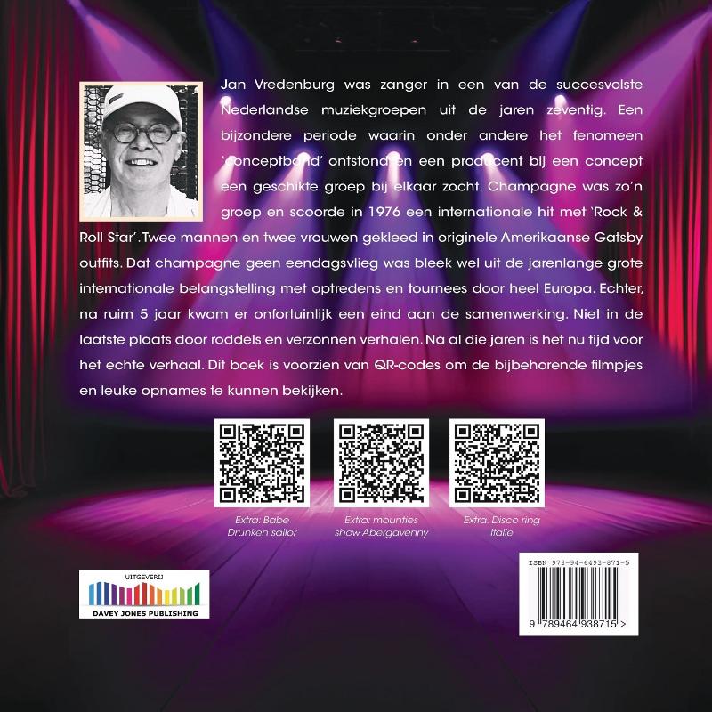 Jan Vredenburg was zanger in een van de succesvolste Nederlandse muziekgroepen uit de jaren zeventig. Een bijzondere periode waarin onder andere het fenomeen ‘conceptband’ ontstond en een producent bij een concept een geschikte groep bij elkaar zocht. Champagne was zo’n groep en scoorde in 1976 een internationale hit met ‘Rock & Roll Star’. Twee mannen en twee vrouwen gekleed in originele Amerikaanse Gatsby outfits. Dat champagne geen eendagsvlieg was bleek wel uit de jarenlange grote internationale belangstelling met optredens en tournees door heel Europa. Echter, na ruim 5 jaar kwam er onfortuinlijk een eind aan de samenwerking. Niet in de laatste plaats door roddels en verzonnen verhalen. Na al die jaren is het nu tijd voor het echte verhaal. Dit boek is voorzien van QR-codes om de bijbehorende filmpjes en leuke opnames te kunnen bekijken.