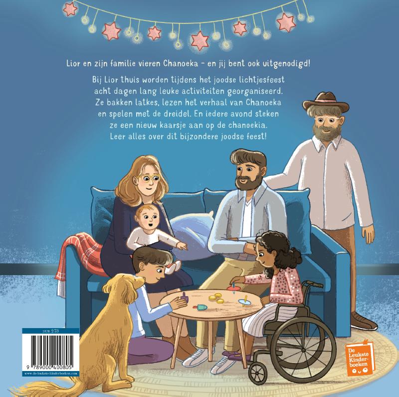Leer alles over het joodse lichtjesfeest Chanoeka Lior en zijn familie vieren Chanoeka, het joodse lichtjesfeest – en jij bent ook uitgenodigd! Bij Lior thuis worden tijdens dit feest allerlei leuke activiteiten georganiseerd. Ze bakken latkes, lezen het verhaal over Chanoeka en spelen met de dreidel. En acht dagen lang steken ze iedere dag een nieuw kaarsje aan op de chanoekia. Achter in het boek staan tips om zelf Chanoeka te vieren, waaronder met een heerlijk recept voor de lekkerste latkes en instructies om je eigen tsedaka-doos te maken. Ontdek zelf ook de magie van Chanoeka! Chanoeka is een hartverwarmend prentenboek voor kinderen vanaf 4 jaar over een van de belangrijkste joodse feestdagen.