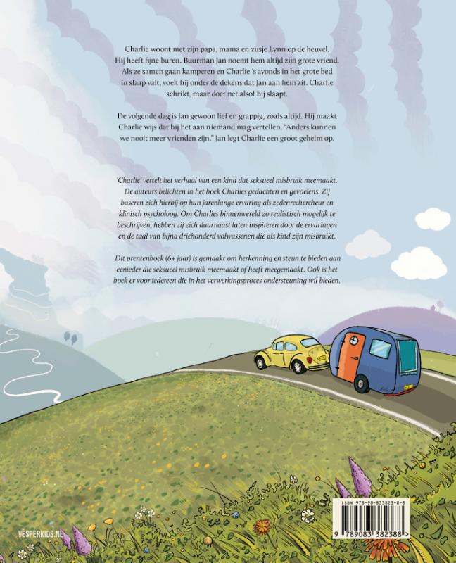 Charlie woont met zijn papa, mama en zusje Lynn op de heuvel. Hij heeft fijne buren. Buurman Jan noemt hem altijd zijn grote vriend. Als ze samen gaan kamperen en Charlie ‘s avonds in het grote bed in slaap valt, voelt hij onder de dekens dat Jan aan hem zit. Charlie schrikt, maar doet net alsof hij slaapt. De volgende dag is Jan gewoon lief en grappig, zoals altijd. Hij maakt Charlie wijs dat hij het aan niemand mag vertellen. “Anders kunnen we nooit meer vrienden zijn.” Jan legt Charlie een groot geheim op. - 'Charlie' vertelt het verhaal van een kind dat seksueel misbruik meemaakt. De auteurs belichten in het boek de gedachten en gevoelens van Charlie. Zij baseren zich hierbij op hun jarenlange ervaring als zedenrechercheur en klinisch psycholoog. Om Charlies binnenwereld zo realistisch mogelijk te beschrijven, hebben zij zich daarnaast laten inspireren door de ervaringen en de taal van bijna driehonderd volwassenen die als kind zijn misbruikt. Dit prentenboek (6+ jaar) is gemaakt om herkenning en steun te bieden aan eenieder die seksueel misbruik meemaakt of heeft meegemaakt. Ook is het boek er voor iedereen die in het verwerkingsproces ondersteuning wil bieden. Bekend van o.a. LINDA, NOS.nl, NPO Radio 1, RTL Nieuws en Ouders van Nu.