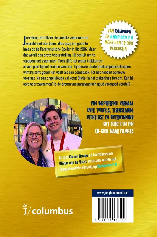 Na de teleurstelling op de Paralympics in Rio lijkt Olivier klaar met het topzwemmen. Maar het water blijft trekken en al snel pakt hij het trainen weer op. Tijdens de studentenkampioenschappen – niet eens para – wint hij goud! Het voelt als een comeback. Tot het noodlot opnieuw toeslaat. Een ongelukkige val eindigt in een gebroken heup en een ziekenhuisbed. Oude angsten steken de kop op. Moet hij wéér een prothese? Is terugkomen nog mogelijk of is de droom van olympisch goud voorgoed voorbij? Een inspirerend verhaal over een leven vol twijfels, tegenslagen, maar ook vechtlust en overwinning. • vervolg op Kampioen 2.0, dat afsloot met Olivier die zilver wint op de Paralympics in Rio, maar blijft dromen over goud … • inclusief fotokatern en QR-code naar extra beeldmateriaal Hoofdpersoon Olivier van de Voort en auteur Corien Oranje schreven ook weer samen dit vervolg op Kampioen 2.0, het boek dat al zoveel kinderen en jongeren geïnspireerd heeft.