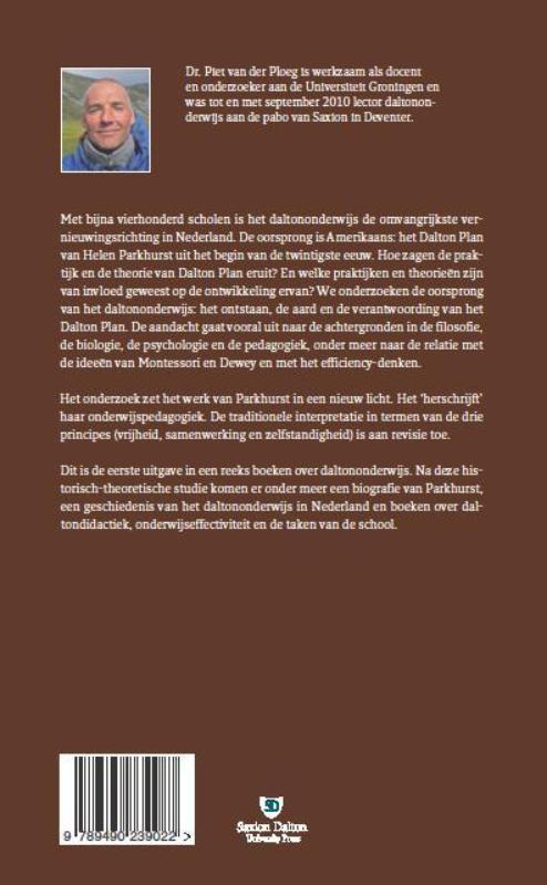 Met bijna vierhonderd scholen is het daltononderwijs de omvangrijkste vernieuwingsrichting in Nederland. De oorsprong is Amerikaans: het Dalton Plan van Helen Parkhurst uit het begin van de twintigste eeuw. Hoe zagen de praktijk en de theorie van Dalton Plan eruit? En welke praktijken en theorieën zijn van invloed geweest op de ontwikkeling ervan? We onderzoeken de oorsprong van het daltononderwijs: het ontstaan, de aard en de verantwoording van het Dalton Plan. De aandacht gaat vooral uit naar de achtergronden in de filosofie, de biologie, de psychologie en de pedagogiek, onder meer naar de relatie met de ideeën van Montessori en Dewey en met het efficiency-denken. Het onderzoek zet het werk van Parkhurst in een nieuw licht. Het ‘herschrijft’ haar onderwijspedagogiek. De traditionele interpretatie in termen van de drie principes (vrijheid, samenwerking en zelfstandigheid) is aan revisie toe. Dit is de eerste uitgave in een reeks boeken over daltononderwijs. Na deze historisch-theoretische studie komen er onder meer een biografie van Parkhurst, een geschiedenis van het daltononderwijs in Nederland en boeken over daltondidactiek, onderwijseffectiviteit en de taken van de school.