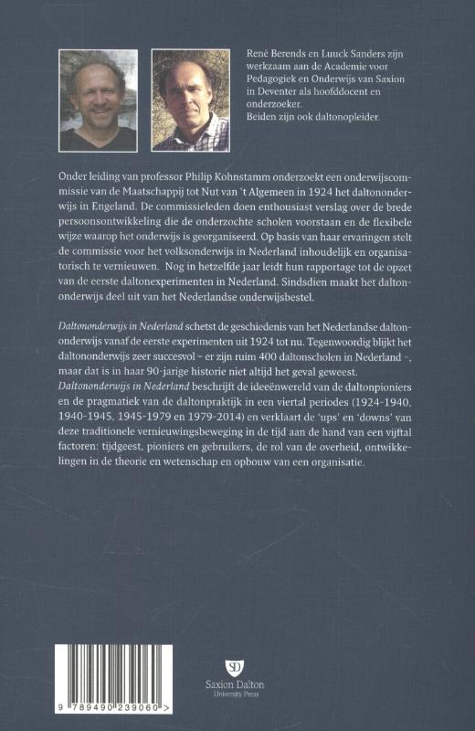 Onder leiding van professor Philip Kohnstamm onderzoekt een onderwijscommissie van de Maatschappij tot Nut van ’t Algemeen in 1924 het daltononderwijs in Engeland. De commissieleden doen enthousiast verslag over de brede persoonsontwikkeling die de onderzochte scholen voorstaan en de flexibele wijze waarop het onderwijs is georganiseerd. Op basis van haar ervaringen stelt de commissie voor het volksonderwijs in Nederland inhoudelijk en organisatorisch te vernieuwen. Nog in hetzelfde jaar leidt hun rapportage tot de opzet van de eerste daltonexperimenten in Nederland. Sindsdien maakt het daltononderwijs deel uit van het Nederlandse onderwijsbestel. Daltononderwijs in Nederland schetst de geschiedenis van het Nederlandse daltononderwijs vanaf de eerste experimenten uit 1924 tot nu. Tegenwoordig blijkt het daltononderwijs zeer succesvol – er zijn ruim 400 daltonscholen in Nederland -, maar dat is in haar 90-jarige historie niet altijd het geval geweest. Daltononderwijs in Nederland beschrijft de ideeënwereld van de daltonpioniers en de pragmatiek van de daltonpraktijk in een viertal periodes (1924-1940, 1940-1945, 1945-1979 en 1979-2014) en verklaart de ‘ups’ en ‘downs’ van deze traditionele vernieuwingsbeweging in de tijd aan de hand van een vijftal factoren: tijdgeest, pioniers en gebruikers, de rol van de overheid, ontwikkelingen in de theorie en wetenschap en opbouw van een organisatie. René Berends en Luuck Sanders zijn werkzaam aan de Academie voor Pedagogiek en Onderwijs van Saxion in Deventer als hoofddocent en onderzoeker. Beiden zijn ook daltonopleider.