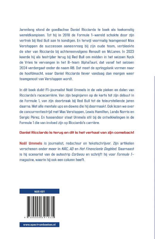 Het verhaal van publiekslieveling Daniel Ricciardo Jarenlang stond de goedlachse Daniel Ricciardo te boek als toekomstig wereldkampioen. Tot hij in 2018 de Formule 1-wereld schokte door zijn vertrek bij Red Bull aan te kondigen. En terwijl voormalig teamgenoot Max Verstappen de successen aaneenreeg bij zijn oude team, verbleekte de ster van Ricciardo bij achtereenvolgens Renault and McLaren. In 2023 keerde hij als testrijder terug bij Red Bull om midden in het seizoen Nyck de Vries te vervangen in het b-team AlphaTauri. Dat moet de springplank vormen naar de hoofdmacht, waar Daniel Ricciardo liever vandaag dan morgen weer teamgenoot van Verstappen wordt. In dit boek duikt F1-journalist Noël Ummels in de vele pieken en dalen van Ricciardo’s racecarrière. Van zijn beginjaren op de karts tot zijn debuut in de Formule 1, van zijn doorbraak bij Red Bull tot de teleurstellende jaren daarna. Met alle mentale ups en downs die hij doormaakt. Ook lezen we over de concurrentiestrijd met Verstappen, Lewis Hamilton, Lando Norris en Sergio Pérez. En tussendoor staat Ummels stil bij de ontwikkelingen in de Formule 1 die van invloed zijn op Ricciardo’s carrière. Daniel Ricciardo is terug en dit is het verhaal van zijn comeback! Noël Ummels is journalist, redacteur en tekstschrijver. Zijn artikelen verschenen onder meer in NRC , AD en Het Financieele Dagblad . Daarnaast is hij scenarist van de autostrip Carbeau en schrijft hij voor Formule 1- magazine, waarin hij een column heeft.