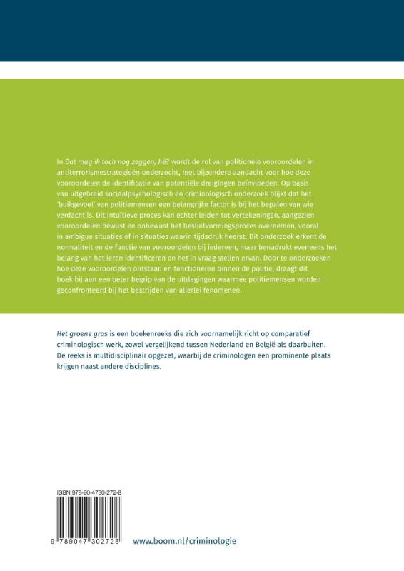 In Dat mag ik toch nog zeggen, hè? wordt de rol van politionele vooroordelen in antiterrorismestrategieën onderzocht, met bijzondere aandacht voor hoe deze vooroordelen de identicatie van potentiële dreigingen beïnvloeden. Op basis van uitgebreid sociaalpsychologisch en criminologisch onderzoek blijkt dat het ‘buikgevoel’ van politiemensen een belangrijke factor is bij het bepalen van wie verdacht is. Dit intuïtieve proces kan echter leiden tot vertekeningen, aangezien vooroordelen bewust en onbewust het besluitvormingsproces overnemen, vooral in ambigue situaties of in situaties waarin tijdsdruk heerst. Dit onderzoek erkent de normaliteit en de functie van vooroordelen bij iedereen, maar benadrukt eveneens het belang van het leren identiceren en het in vraag stellen ervan. Door te onderzoeken hoe deze vooroordelen ontstaan en functioneren binnen de politie, draagt dit boek bij aan een beter begrip van de uitdagingen waarmee politiemensen worden geconfronteerd bij het bestrijden van allerlei fenomenen. Het groene gras is een boekenreeks die zich voornamelijk richt op comparatief criminologisch werk, zowel vergelijkend tussen Nederland en België als daarbuiten. De reeks is multidisciplinair opgezet, waarbij de criminologen een prominente plaats krijgen naast andere discipline.