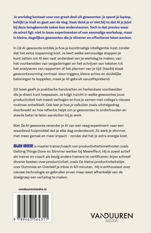 Je werkdag bestaat voor een groot deel uit gewoontes: je opent je laptop, bekijkt je mail en gaat aan de slag. Vaak denk je er niet bij na dat AI je juist bij deze terugkerende taken kan ondersteunen. Toch is dat precies waar de winst ligt: niet in losse experimenten of een eenmalige workshop, maar in kleine, dagelijkse gewoontes die je slimmer en effectiever laten werken. In De AI-gewoonte ontdek je hoe je kunstmatige intelligentie inzet zonder dat het extra inspanning kost. Je leert welke eenvoudige stappen je kunt zetten om AI een vast onderdeel van je werkdag te maken, van het voorbereiden van vergaderingen en het schrijven van teksten tot het analyseren van rapporten of het plannen van je tijd. Daarbij staat gewoontevorming centraal: door triggers, kleine acties en duidelijke beloningen te koppelen, maak je AI-gebruik vanzelfsprekend. Dit boek geeft je praktische handvatten en herkenbare voorbeelden die je direct kunt toepassen. Je krijgt inzicht in welke gewoontes jouw productiviteit het meest verhogen en hoe je samen met collega’s nieuwe routines ontwikkelt. Ook leer je hoe je valkuilen zoals uitstelgedrag doorbreekt en hoe reflectie helpt om je gewoontes te onderhouden en steeds beter te laten aansluiten bij je werk. Met De AI-gewoonte verander je AI van een vaag experiment naar een waardevol hulpmiddel dat je elke dag ondersteunt. Zo werk je slimmer, met meer gemak en meer impact – zonder dat het je extra energie kost. Trefwoorden: ai