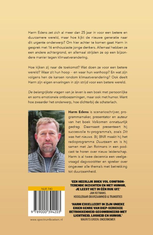16 persoonlijke, soms emotionele gesprekken met jonge denkers over onze toekomst Harm Edens zet zich al meer dan 25 jaar in voor een betere en duurzamere wereld, maar hoe kijkt de nieuwe generatie naar dit urgente onderwerp? Om hier achter te komen gaat Harm in gesprek met 16 enthousiaste jonge denkers. Allemaal hebben ze een andere achtergrond, en allemaal strijden ze op een bijzondere manier tegen klimaatverandering. Hoe kijken zij naar de toekomst? Wat doen ze voor een betere wereld? Waar zit hun hoop – en waar hun wanhoop? En wat zijn volgens hen de kansen rondom klimaatverandering? Ook deelt Harm zijn eigen ervaringen in zijn strijd voor een betere wereld. De belangrijkste vragen van je leven is een boek met persoonlijke en soms emotionele ontboezemingen, maar ook met humor. Want hoe zwaarder het onderwerp, hoe dichterbij de schaterlach. Harm Edens is scenarioschrijver, programmamaker, presentator en auteur van het boek Volkomen onnatuurlijk gedrag . Daarnaast presenteert hij succesvolle tv-programma’s, zoals Dit was het nieuws . Bij BNR maakt hij het radioprogramma Duurzaam en is hij samen met Jan Rotmans in een podcast te horen over nieuw leiderschap. Harm is al twee decennia een veelgevraagd dagvoorzitter en spreker over ongeveer alle thema’s met betrekking tot duurzaamheid. ‘Een heerlijk boek vol confronterende inzichten en met humor, je leest het in één ruk uit.’ Jan Rotmans, hoogleraar Duurzaamheid & Transities ‘Harm excelleert in zijn unieke eigen genre van diep-serieuze betrokkenheid gecombineerd met lichtheid, losheid en humor.’ Maurits Groen, ondernemer