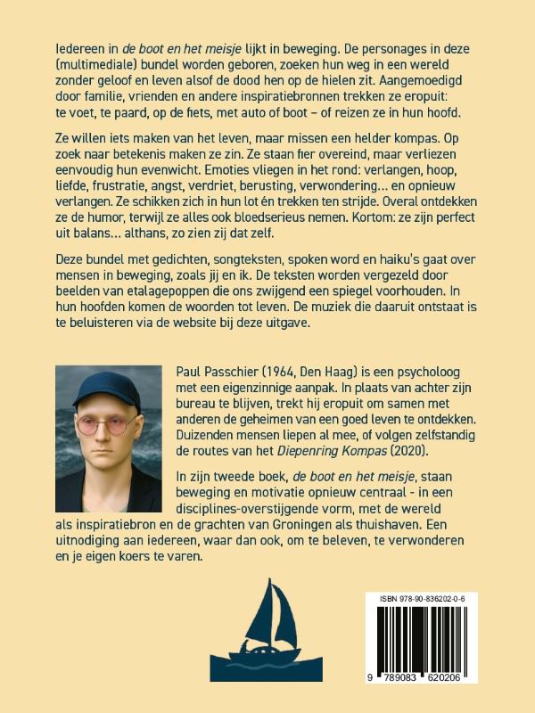 Iedereen in de boot en het meisje lijkt in beweging. De personages in deze (multimediale) bundel worden geboren, zoeken hun weg in een wereld zonder geloof en leven alsof de dood hen op de hielen zit. Aangemoedigd door familie, vrienden en andere inspiratiebronnen trekken ze eropuit: te voet, te paard, op de fi ets, met auto of boot – of reizen ze in hun hoofd. Ze willen iets maken van het leven, maar missen een helder kompas. Op zoek naar betekenis maken ze zin. Ze staan fi er overeind, maar verliezen eenvoudig hun evenwicht. Emoties vliegen in het rond: verlangen, hoop, liefde, frustratie, angst, verdriet, berusting, verwondering… en opnieuw verlangen. Ze schikken zich in hun lot én trekken ten strijde. Overal ontdekken ze de humor, terwijl ze alles ook bloedserieus nemen. Kortom: ze zijn perfect uit balans… althans, zo zien zij dat zelf. Deze bundel met gedichten, songteksten, spoken word en haiku’s gaat over mensen in beweging, zoals jij en ik. De teksten worden vergezeld door beelden van etalagepoppen die ons zwijgend een spiegel voorhouden. In hun hoofden komen de woorden tot leven. De muziek die daaruit ontstaat is te beluisteren via de website bij deze uitgave. Paul Passchier (1964, Den Haag) is een psycholoog met een eigenzinnige aanpak. In plaats van achter zijn bureau te blijven, trekt hij eropuit om samen met anderen de geheimen van een goed leven te ontdekken. Duizenden mensen liepen al mee, of volgen zelfstandig de routes van het Diepenring Kompas (2020). In zijn tweede boek, de boot en het meisje , staan beweging en motivatie opnieuw centraal - in een disciplines-overstijgende vorm, met de wereld als inspiratiebron en de grachten van Groningen als thuishaven. Een uitnodiging aan iedereen, waar dan ook, om te beleven, te verwonderen en je eigen koers te varen.
