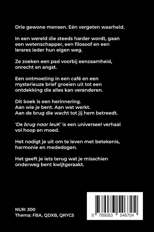 Wil je helderheid, richting en een nieuwe start die zin geeft? “De brug naar leuK” is een warm, verhalend en hoopvol boek dat je meeneemt in een reis vol herkenning, groei en innerlijke helderheid. Door de drie hoofdpersonages te volgen, ontdek je hoe bewust leven, compassievolle keuzes en de tijdloze kracht van De Gulden Regel opnieuw ruimte kunnen maken in je eigen leven. In dit verhaal zie je hoe mensen verandering vinden in kleine gebaren, nieuwe inzichten en momenten van moed. Niet via oefeningen of stappenplannen, maar door mee te leven met personages die hun weg terugvinden naar betekenis, verbinding en richting — thuis, in relaties en in de wereld om hen heen. Je ontdekt hoe je: • De Gulden Regel inzet voor duidelijke en eerlijke keuzes • Dagelijkse gewoonten opbouwt die rust en helderheid brengen • Kleine stappen gebruikt om meer richting en innerlijke kracht te ontwikkelen “De brug naar leuK” biedt je een zachte en mensgerichte manier om een leven te creëren dat echt bij je past — een leven dat je vandaag kunt beginnen, misschien wel leuKer dan je dacht.