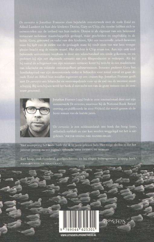 De correcties is Jonathan Franzens alom bejubelde meesterwerk over de oude Enid en Alfred Lambert en hun drie kinderen Denise, Gary en Chip, die moeite hebben zich te ontworstelen aan de invloed van hun ouders. Denise is als eigenaar van een bekroond restaurant weliswaar maatschappelijk geslaagd, maar gescheiden en ongelukkig in de liefde. Gary, getrouwd en vader van drie kinderen, lijkt een succesvolle suburb -bewoner, maar hij lijdt aan de ziekte van de geslaagde man: hij vindt niets van wat hem vroeger plezier bracht nog de moeite waard. Het slechtst is Chip eraan toe. Aan zijn ooit veelbelovende universitaire loopbaan is door een seksschandaal een einde gekomen, en nu probeert hij zijn net afgeronde scenario aan een filmproducent te verkopen. Als hij bij toeval de echtgenoot van zijn minnares ontmoet komt hij terecht in een maalstroom van hilarische en volstrekt onvoorspelbare gebeurtenissen. Intussen probeert Gary het familiekapitaal van zijn dementerende vader te behoeden voor totaal verval en gaan de oude Enid en Alfred hun noodlot tegemoet op een cruiseschip. Jonathan Franzen geeft met De correcties een hilarische en overrompelende visie op de ziel van de westerse maatschappij. Nu al kan het boek, waarvoor Franzen de National Book Award kreeg, met recht een van de grote romans van de 21ste eeuw worden genoemd. Jonathan Franzen (1959) woont en werkt in New York. Hij publiceerde eerder de romans De 27ste stad en Schokgolven. In 2006 verscheen De onbehaaglijkheidsfactor . ‘ De correcties is een zeldzaamheid: een boek dat hoog inzet, stilistisch verbluft en niet kan worden weggelegd tot het is uitgelezen.’ Pieter Steinz, NRC Handelsblad ‘Met voorsprong het beste boek dat ik in jaren gelezen heb. Het enige slechte is dat het jammer genoeg na 502 pagina’s ophoudt.’ Yves Desmet, De Morgen ‘Een knap, onderhoudend, goedgeschreven en bij vlagen buitengewoon grappig boek.’ Hans Bouman, De Volkskrant