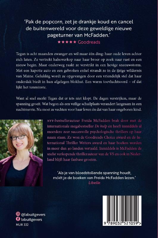 Tegan is acht maanden zwanger, alleen en probeert wanhopig om haar leven op de rit de krijgen. Terwijl ze onderweg is naar haar broer, rijdt ze recht op een sneeuwstorm af. Gestrand op het platteland van Maine vraagt Tegan zich af of ze geen enorme fout heeft gemaakt. Dan wordt ze gered door een stel dat haar onderdak biedt. Maar er klopt iets niet. Tegan moet er alles aan doen om zichzelf en haar ongeboren kind te redden. ‘Als je van bloedstollende spanning houdt, móét je de boeken van Freida McFadden lezen.’ - Libelle