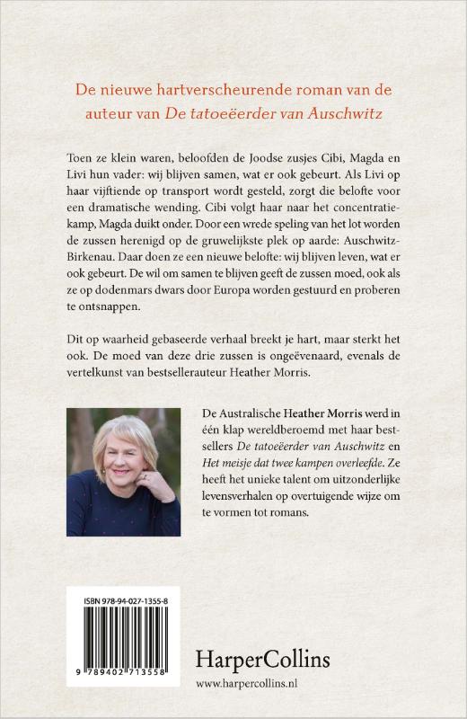 Adembenemende roman van de bestsellerauteur van De tatoeëerder van Auschwitz. Toen ze klein waren, beloofden de Joodse zusjes Cibi, Magda en Livi hun vader: wij blijven samen, wat er ook gebeurt. Als Livi op haar vijftiende op transport wordt gesteld, zorgt die belofte voor een dramatische wending. Cibi volgt haar naar het concentratiekamp, Magda duikt onder. Door een wrede speling van het lot worden de zussen herenigd op de gruwelijkste plek op aarde: Auschwitz-Birkenau. Daar doen ze een nieuwe belofte: wij blijven leven, wat er ook gebeurt. De wil om samen te blijven geeft de zussen moed, ook als ze op dodenmars dwars door Europa worden gestuurd en proberen te ontsnappen. Dit op waarheid gebaseerde verhaal breekt je hart, maar sterkt het ook. De moed van deze drie zussen is ongeëvenaard, evenals de vertelkunst van bestsellerauteur Heather Morris. Over het werk van Heather Morris: ‘Een mooi, indrukwekkend en aangrijpend verhaal over familie, belofte, kracht en hoop.’ Hebban ‘Dit prachtige liefdesverhaal laat niemand onberoerd.’ Libelle ‘Enorm tot de verbeelding sprekend.’ Gazet van Antwerpen