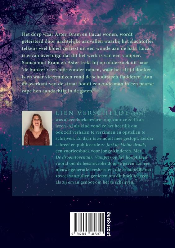 Het dorp waar Aster, Bram en Lucas wonen, wordt geteisterd door nachtelijke aanvallen waarbij het slachtoffer telkens veel bloed verliest uit een wonde aan de hals. Lucas is ervan overtuigd dat dit het werk is van een vampier. Samen met Bram en Aster trekt hij op onderzoek uit naar ‘de bunker’: een huis zonder ramen, waar het altijd donker is en waar vleermuizen rond de schoorsteen fladderen. Aan de overkant van de straat houdt een oude man in een paarse cape hen aandachtig in de gaten. Een razend spannend avontuur waarin dromen en realiteit met elkaar vermengd raken.