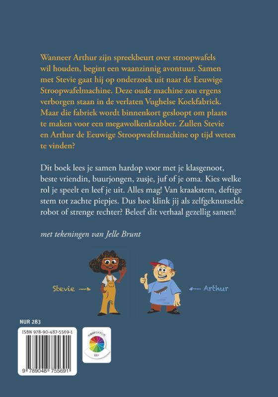 Wanneer Arthur zijn spreekbeurt over stroopwafels wil houden, begint een waanzinnig avontuur. Samen met Stevie gaat hij op onderzoek uit naar de Eeuwige Stroopwafelmachine. Deze oude machine zou ergens verborgen staan in de verlaten Vughelse Koekfabriek. Maar die fabriek wordt binnenkort gesloopt om plaats te maken voor een megawolkenkrabber. Zullen Stevie en Arthur de Eeuwige Stroopwafelmachine op tijd weten te vinden? Dit boek lees je samen hardop voor met je klasgenoot, beste vriendin, buurjongen, zusje, juf of je oma. Kies welke rol je speelt en leef je uit. Alles mag! Van kraakstem, deftige stem tot zachte piepjes. Dus hoe klink jij als je een zelfgeknutselde robot of als een strenge rechter? Beleef dit verhaal gezellig samen!
